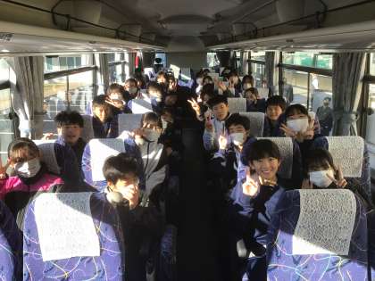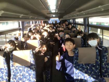 本日、1年生の11・12・13・14学級は、SDGs校外学習で、東部給食センターとエコットを訪問します。先ほどバスに乗り、出発しました。写真は、上から13学級と14学級です。