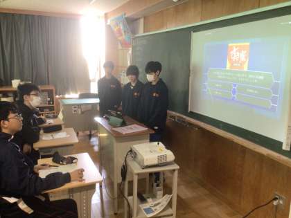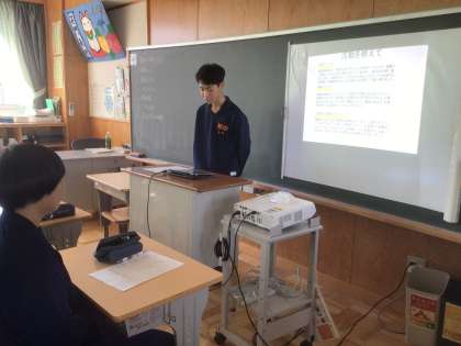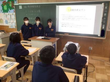 2年生が職場体験で学んだことや働くことについて1年生に発表しています