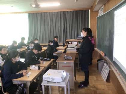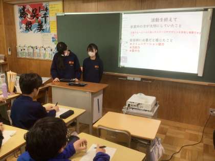 2年生が職場体験で学んだことや働くことについて1年生に発表しています。