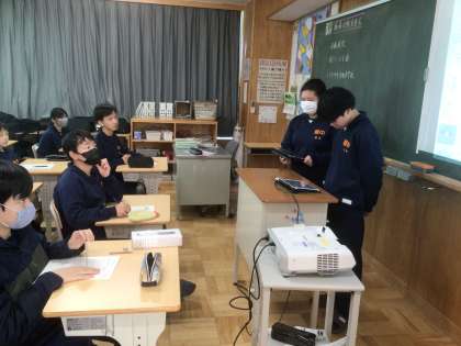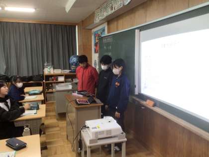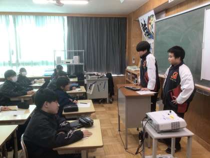2年生が職場体験で学んだことや働くことについて1年生に発表しています。