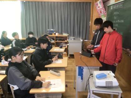 2年生が職場体験で学んだことや働くことについて1年生に発表しています。