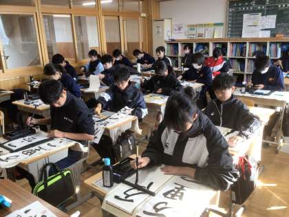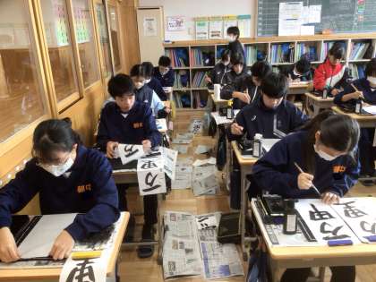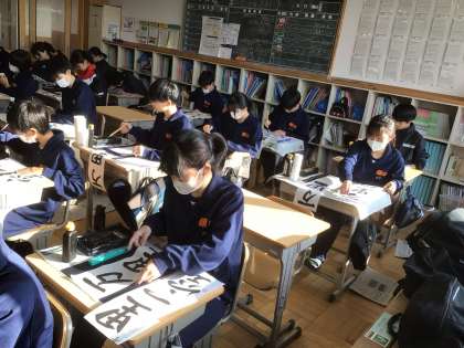 12学級の国語です。書き初めに取り組んでいます。書いている言葉は「万里一空」です。