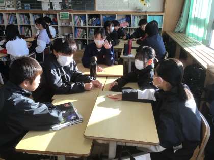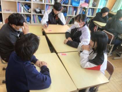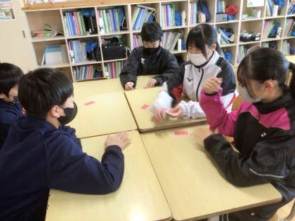 12/9(火)朝の様子3 公開日 2025/12/09 更新日 2025/12/09 輝く朝中生! 13学級です。今朝の話し合い活動は、トランプの数字を使って、話し合う活動に取り組んでいます。グループの仲間に言葉で伝える力を高めています。 1年