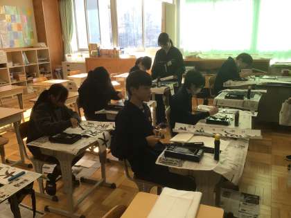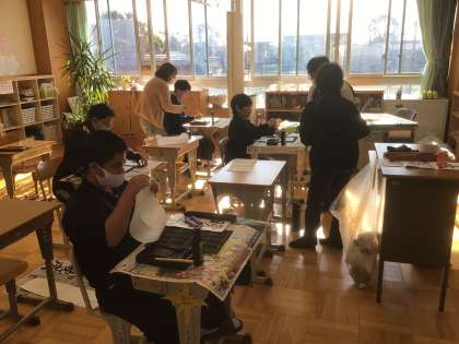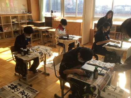 1・2・3・4・5・6学級の国語です。本日は書道の講師の方を招いて、習字の授業を実施しています。