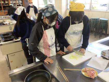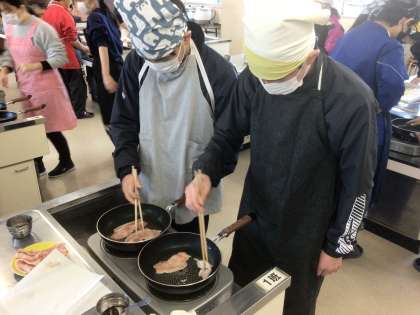 27学級の家庭科です。豚肉のしょうが焼きとキャベツの千切りを作っています。