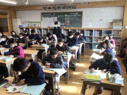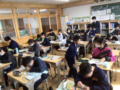 12/16(火)授業の様子1 公開日 2025/12/16 更新日 2025/12/16 輝く朝中生! 11学級の数学です。コンパスや分度器を使用しながら、円とおうぎ形の性質について学習しています。 1年