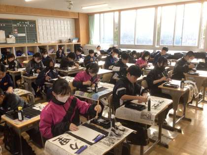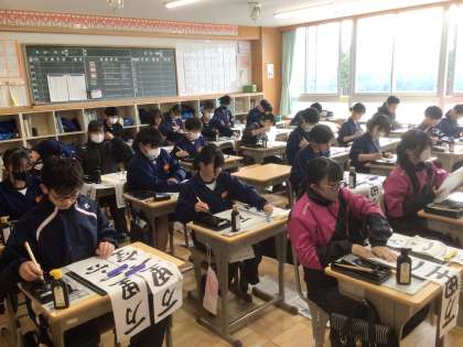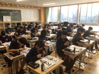 本日は、書き初め大会です。1年生は「万里一空」です。写真は上から19、18、17学級です。