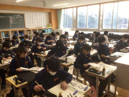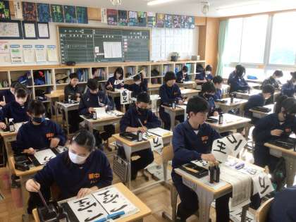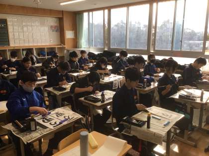 本日は、書き初め大会です。1年生は「万里一空」です。写真は上から16、15、14学級です。
