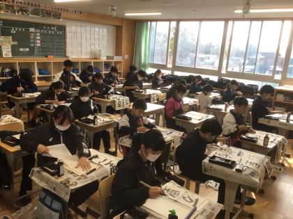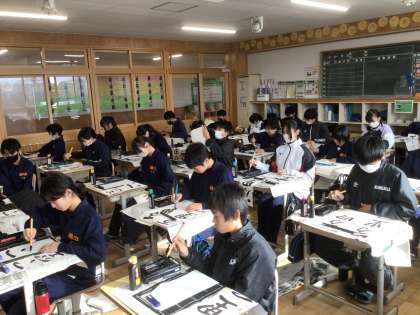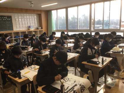 本日は、書き初め大会です。1年生は「万里一空」です。写真は上から13、12、11学級です。