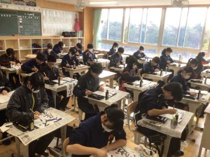 本日は、書き初め大会です。3年生は「不屈の精神」です。写真は上から38、37、36学級です。