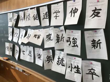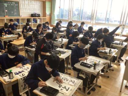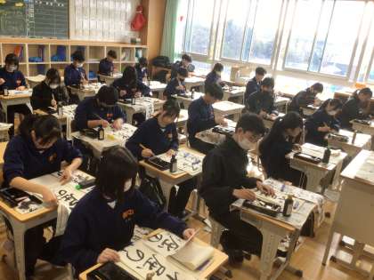 本日は、書き初め大会です。3年生は「不屈の精神」です。写真は上から32、31学級です。一番下は、今年の目標を漢字一字(36学級)です。