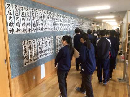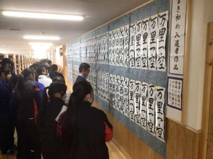 昨日の書き初め大会で金賞、銀賞に輝いた生徒の作品が昇降口前に掲示されています。
