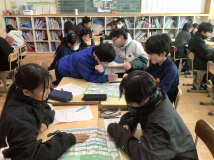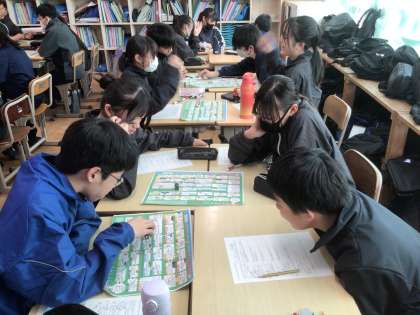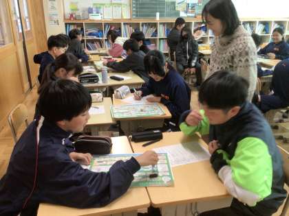 14学級です。ライフキャリアすごろくをしています。自分で進路を選択する活動を通して、中学卒業後の進路を意識しています。