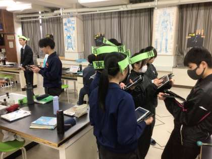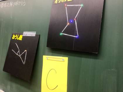 31学級の理科です。頭に方角をつけ、教室の壁で輝く星座を観察し、星座の見え方を学んでいます。