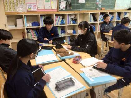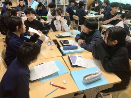 19学級です。職業について調べたことをグループ内で発表しています。