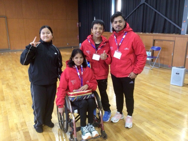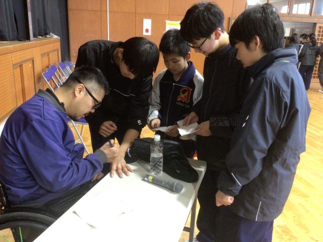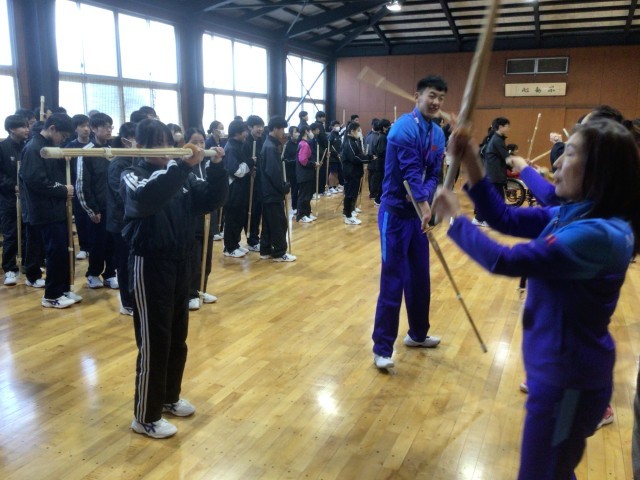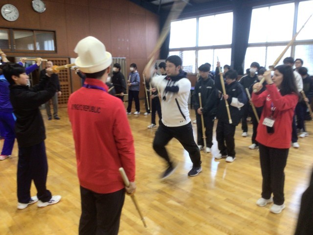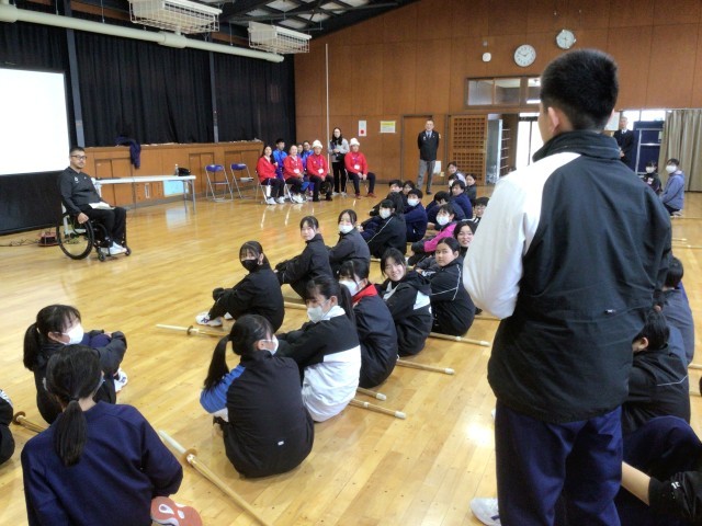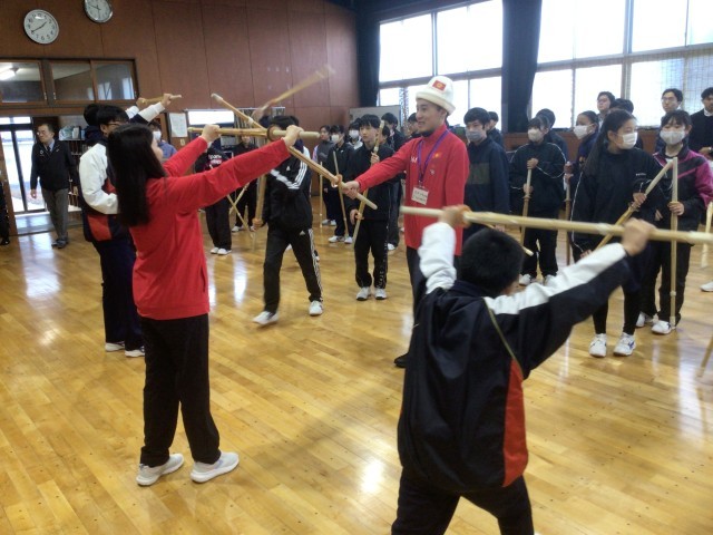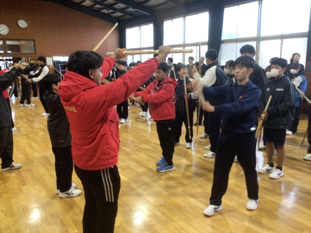 11・12学級の体育です。選手のみなさんと授業で取り組んでいる剣道を楽しみました。