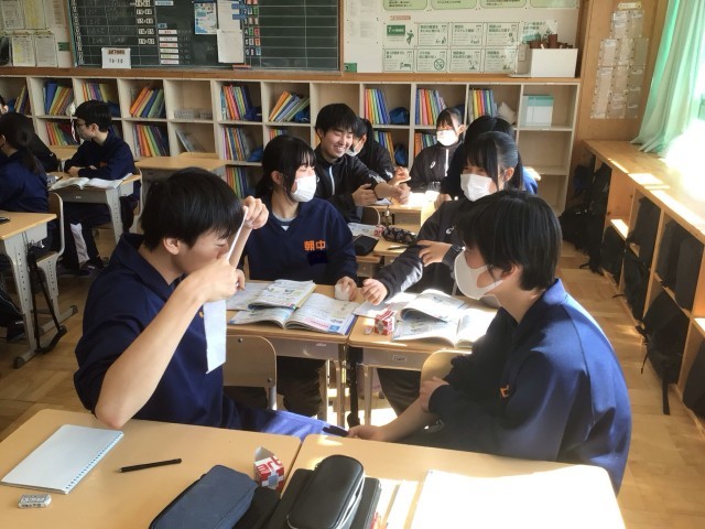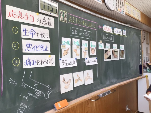 24学級の保健体育です。実際に包帯を使用し、応急手当てについて学んでいます。