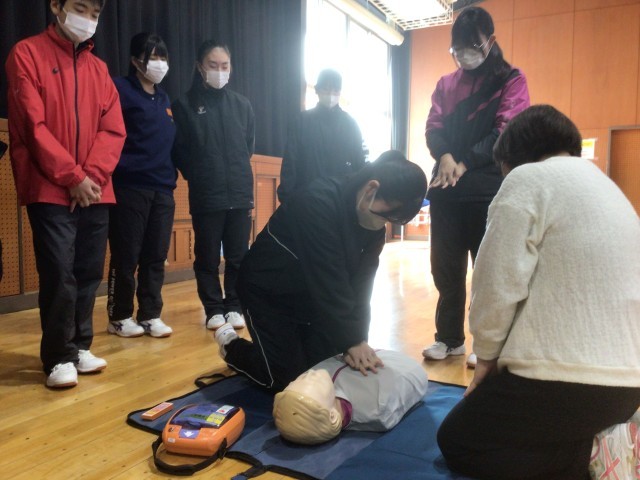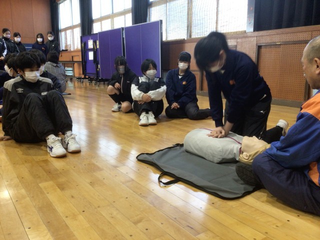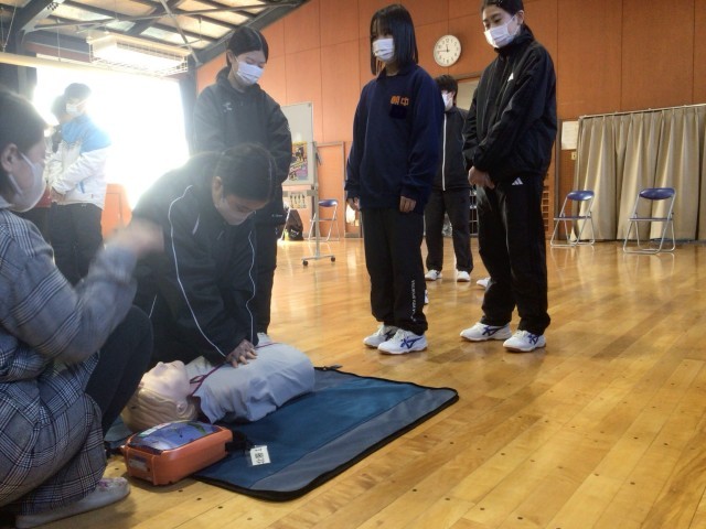 27・28学級の保健体育です。リズムに合わせながら、胸骨圧迫の方法を学んでいます。