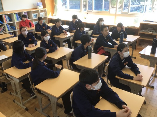 3/12(木)話し合い活動2 公開日 2026/03/12 更新日 2026/03/12 輝く朝中生! 27学級です。本日は、話し合い活動(わくわくタイム)があります。2年生は、先生から出題される高校入試に関するクイズをもとに、卒業後の進路について考えています。 2年