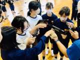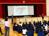 最後のクラスです。 1年6組と7組です。 ヘビを首に巻かせていただきま...
