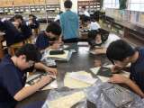 14学級の美術です。アートグラスを作っています。作品を削り終えることを目標にがん...