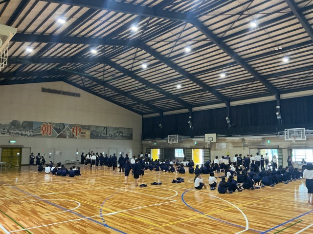 1年生の学年集会の様子です。クイズ形式で中学校について学びました。