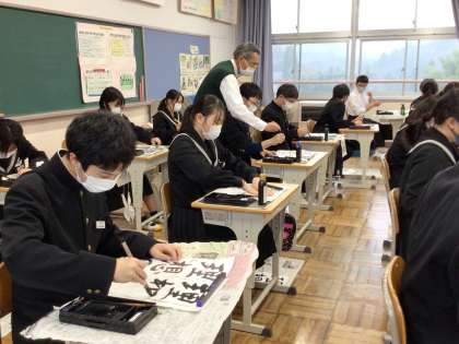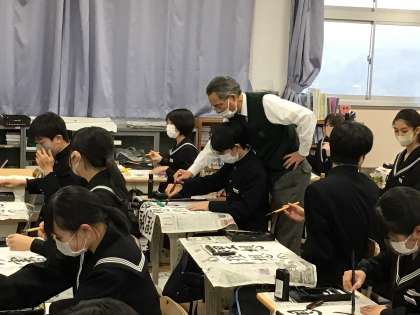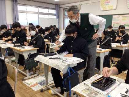 加藤矢舟先生に指導していただきました。一緒に筆を動かしてもらって、こつをつかむことができたようです。