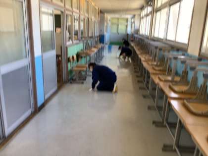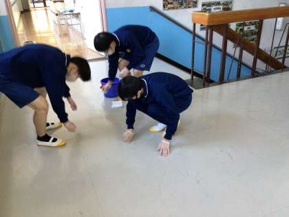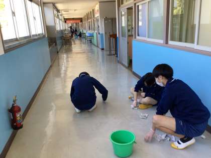 本校の廊下は北館の2階と3階は床が白色です。 汚れがこびりついているところを擦って綺麗にしました。