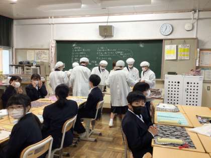 給食初日 公開日 2024/04/08 更新日 2024/04/08 各学年から 1年生にとって、中学校ではじめての給食です。 給食当番の配膳方法も小学校とは少し違うのでしょうか。戸惑いながら準備が始まっています。
