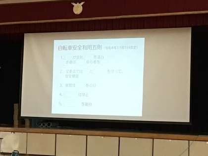 歩道を走るときは歩行者優先など自転車に乗るときのルールを確認したり、実際の事故の事例について事故の原因や事故を防ぐにはどうしたらよいかを考えたりしました。学校周辺の危険箇所の写真を見ながら、どんなことに気をつけなければならないかを教えていただきました。さらに実際に自転車を使って、危険運転について学習しました。