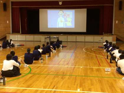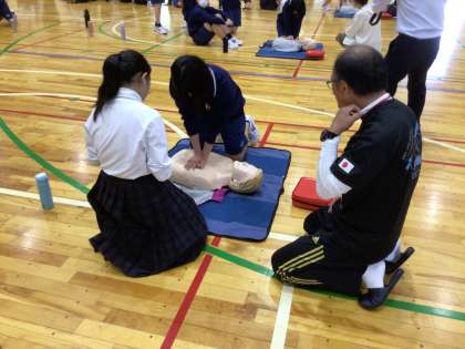 2年生が応急処置教室を受講しました。当日は足助消防署の講師の方々に教えていただきました。DVDを使って心肺蘇生法について学んだあと、人形を使って実際に心臓マッサージやAEDの使い方を学びました。