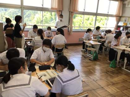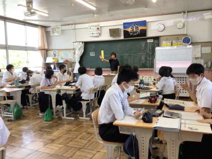 前の時間に出た意見が書かれた黒板の写真が学習用タブレットに配信されて、生徒たちはそれを手元のタブレットで確認することができるようになっています。