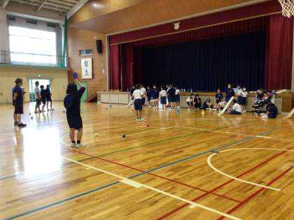 1年 交流会 公開日 2024/07/01 更新日 2024/07/01 各学年から 1年生が、豊田特別支援学校に通う学区の仲間との交流会を実施しました。 パラリンピック種目でもある「ボッチャ」に挑戦、ランプという勾配具を使ってプレイしました。