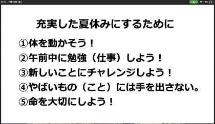健康安全に留意しつつ、自分でこれと決めたことをやり遂げて充実した夏休みになるといいですね。