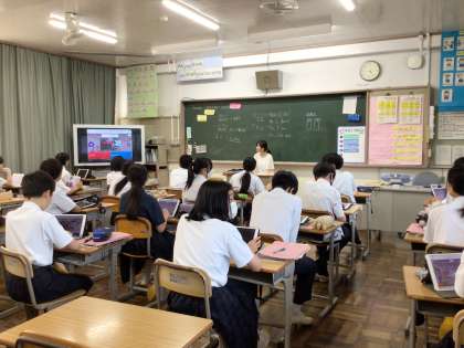 夏休み明け、元気に学習しています。学習用タブレットを使って、クイズ形式で問題に答えています。