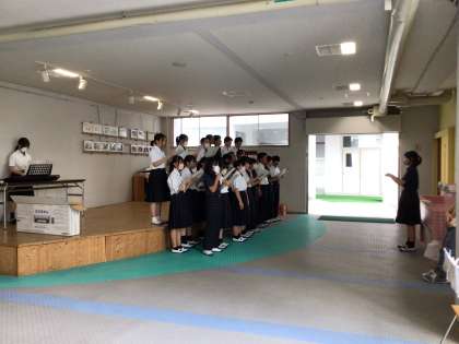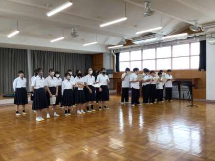 合唱コンクールに向けて 公開日 2024/09/19 更新日 2024/09/19 各学年から 木曜日の長い自活の時間も、校舎内のあちらこちらから歌声が響いています。音楽室では1Aが、ピロティでは2Bが、リーダーの指示でしっかり練習していました。