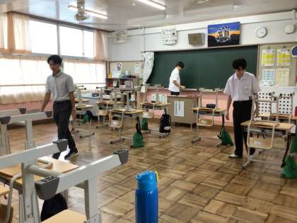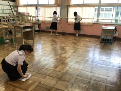 清掃の様子 公開日 2024/09/24 更新日 2024/09/24 特別活動 足助中学校では火曜日と金曜日、週に2回しか清掃の時間がありません。生徒数が減っても、清掃すべき場所の数は変わらないので、少ない人数で頑張っています。さすが3年生は手際よく進めていました。