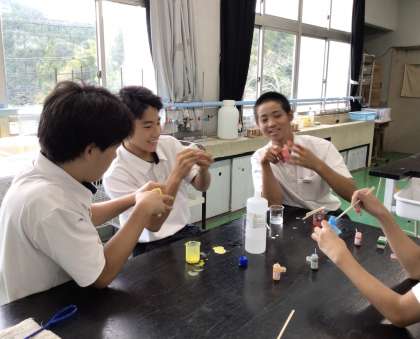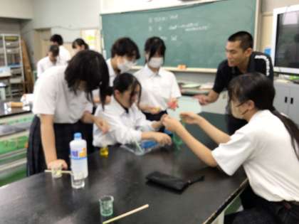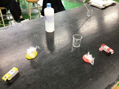 2Bの理科です。スライムを作っているそうです。分量によっては、うまくいかないこともあるそうです。