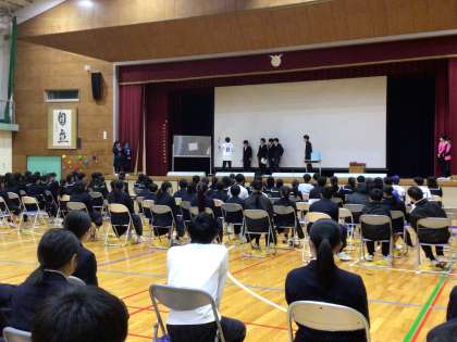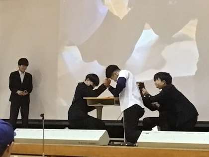 卒業生を送る会 公開日 2025/03/04 更新日 2025/03/04 学校行事 オープニングでくす玉を割った後は、企画スタッフによるA組B組対抗のゲームが行われました。様々な勝負の末、5対4でB組の勝利となりました。