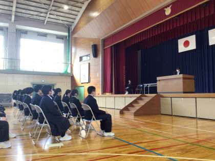 令和6年度修了式 公開日 2025/03/24 更新日 2025/03/24 学校行事 代表生徒がスピーチをしました。後期に頑張ったことや令和7年度に向けての抱負を力強く語ってくれました。 校長式辞では、送る会での1、2年生の取組への評価やエベレスト登山に挑んだ先人の紹介から、一つのことを成し遂げるには努力が必要であること、努力を重ねて一歩でも二歩でも前進できるよう、皆で頑張っていこうと、生徒たちへのメッセージが送られました。