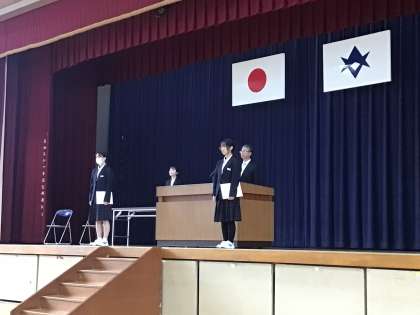 生徒指導主事からは、「事件や事故に巻き込まれないようSNSの使い方に注意すること、春休み中にこの1年を振り返り、4月には新たな前向きな気持ちで次に進めるようにしよう」、部活動主任の先生からは「部活動で登校する場合には学校生活と同じ基準で物事を判断してルールやマナーを守ること。部活動が予定されている日にはスクールバスが運行予定ですが、乗車予定者がいない路線は運行しません。また、一人しか乗らない路線の人は、急な欠席の場合、バス会社への連絡を忘れないようにしてください。」と連絡がありました。