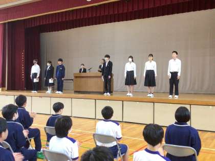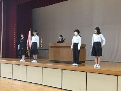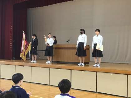 全校朝礼 公開日 2025/05/07 更新日 2025/05/07 学校行事 GW明け、今年度初めての全校朝礼がありました。 愛知県中学生弓道錬成大会で団体3位、個人2位に入賞した弓道部、スプリングカッブで優勝したバレー部の表彰伝達がありました。そして、前期の委員長や学年プログラム委員の認証が行われました。 弓道部は7月21日に行われる日本武道館での大会にも出場が決定しています。