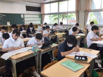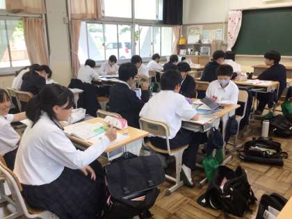 5月21、22日は中間テストです。テスト週間は部活動がないため、下校時間までは教室でテスト勉強をして過ごします。一人で集中して取り組む子、友達と確認し合う子、それぞれ頑張っていますね。明日、力を出せるように今日は早めに寝るようにしてくださいね。