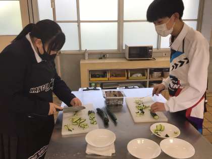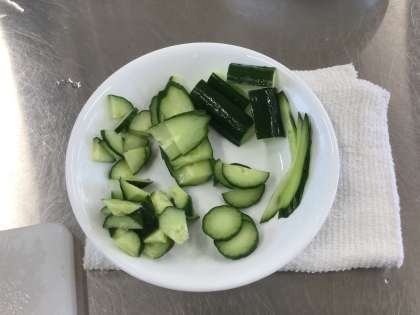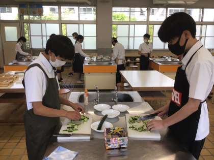2年生 家庭科 きゅうりの切り方テスト 公開日 2025/06/09 更新日 2025/06/09 各学年から 2年生の家庭科の授業で、きゅうりの切り方テストをしています。 一本のきゅうりを7種の切り方で切り分けます。 「難しい〜」と言いながらも頑張って切り分けました。