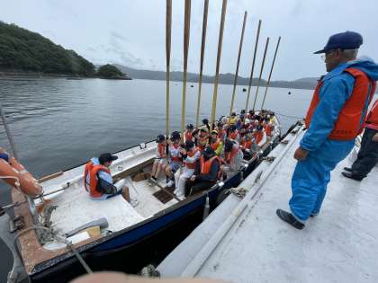 艇長からは「明日のための練習を!元気よく協力して帰ってきましょう!」と言っていただきました。道具の使い方を指導していただき、みんな元気よく海に漕ぎ出して行きました。