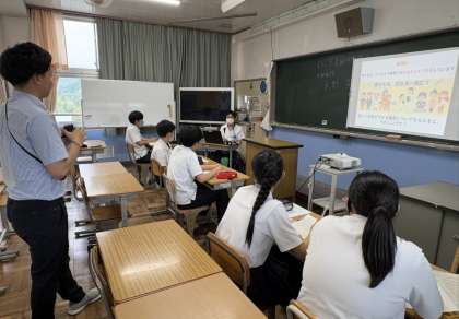 2年生 働く人の話を聞く会 公開日 2025/06/24 更新日 2025/06/24 学校行事 6月23日(月)に、夏休みに職場体験学習を計画している2年生が、地域で働く方々を講師に招いて「働くこと」についてお話を聞きました。