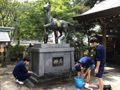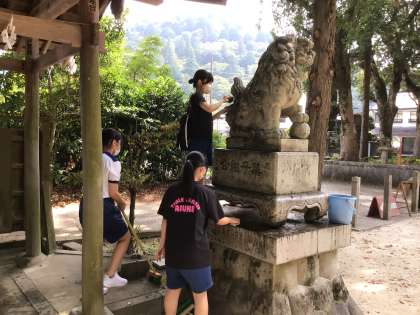3年生総合的な学習の時間 公開日 2025/09/18 更新日 2025/09/18 学校の特色ある活動 清掃活動を進めているグループは、足助八幡宮の掃除をさせていただきました。境内の石塔や狛犬、手水舎などを掃除しました。みんなで汗だくになりながら苔や土汚れをブラシや雑巾でがんばってきれいにしました。