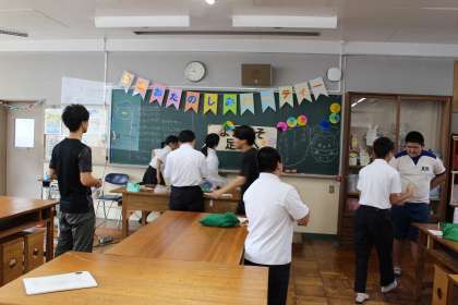 足助お楽しみパーティー 公開日 2025/09/22 更新日 2025/09/22 学校の特色ある活動 9月19日(金)に、足助中学校区の特別支援学級の交流会「足助お楽しみパーティー」が行われました。 当日は、みんなで工作やゲーム、そしてダンスをする活動などがあり、小学生の子たちと仲良く、楽しい時間を過ごしました。EF学級の生徒は、小学生の子たちに楽しんでもらいたいと張り切ってがんばっていました。一生懸命準備した動画やクイズを喜んでもらえてよかったですね。