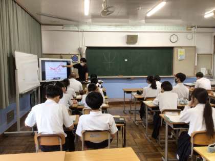 3年生は、関数の授業に取り組んでいます。 先生が説明する大事なポイントを聞き逃すまいと、真剣に聞いています。