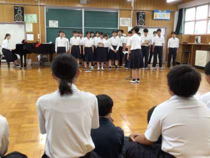 足中祭に向けて(学級活動) 公開日 2025/10/15 更新日 2025/10/15 特別活動 今日の午後予定していたASK活動は、天候不順のため残念ながら17日(金)に延期になりました。 代わりに行った学級活動では、足中祭に向けて、体育大会の競技や合唱練習に励みました。1年生は先輩の合唱を聞いたり、アドバイスをもらったりしていました。